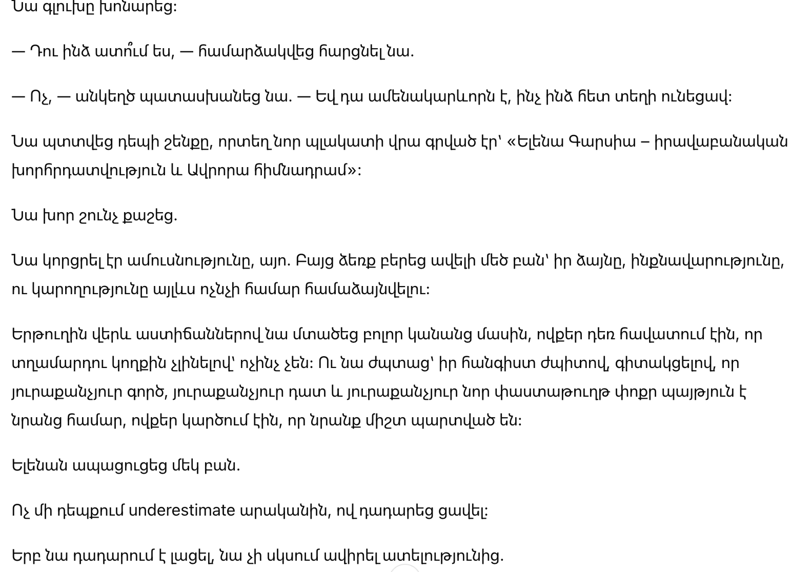 Поднимаясь по лестнице, она думала о всех женщинах, которые всё ещё верили, что, оставаясь без мужчины рядом, они ничто. Она думала обо всех Еленах, которые все еще плачут в тишине. И улыбалась, с этой своей спокойной улыбкой, зная, что каждое дело, каждый суд, каждая новая папка будет маленьким взрывом против идеи, что они всегда проигрывают.