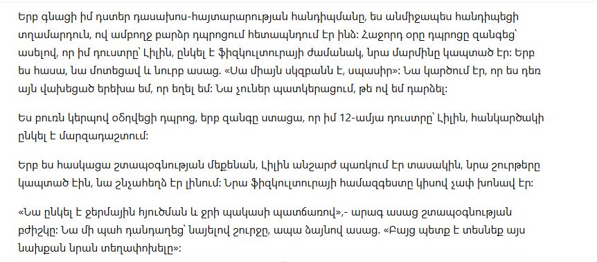 Он заговорил спокойным, будничным тоном, будто происходящее — мелочь: мол, Лили «споткнулась на разминке», она «неуклюжая», возможно, «не позавтракала» и поэтому стало плохо. Его слова звучали слишком гладко, слишком заученно.