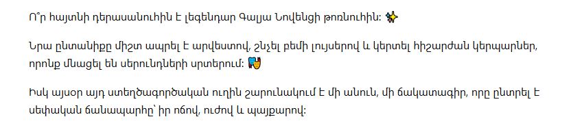 Родные и близкие Галеи Новенц долгие годы были связаны с искусством. В такой атмосфере ребёнок рано учится слышать нюансы — в словах, в паузах, в эмоциях. И даже если путь на сцену не планируется заранее, любовь к творчеству всё равно находит выход: в речи, в манере держаться, в стремлении рассказывать истории.