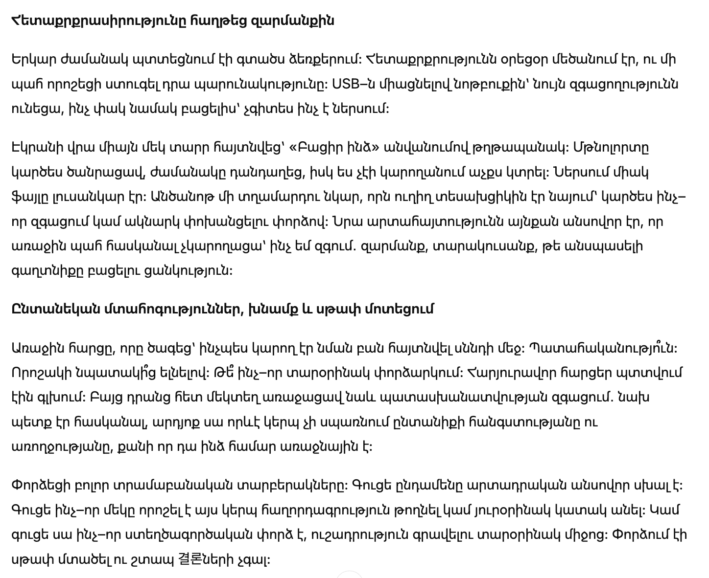 Я долго крутила находку в руках. Интерес к происходящему рос, и в какой-то момент я решила проверить содержимое. Подключив USB к ноутбуку, я ощутила волнение, словно открывала закрытый конверт с неизвестным посланием.