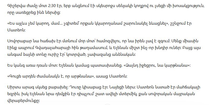 «Я не знаю, какие именно у них границы и что они между собой называют “заботой”, — сказала она. — Но я вижу, что это нездорово. И я точно знаю: ты не можешь продолжать жить там, не получив ответов».