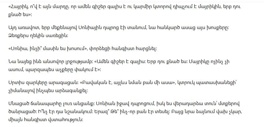 — Это бывает каждую ночь. Когда ты спишь в комнате с мамой. И мама ничего не говорит… просто закрывает глаза.