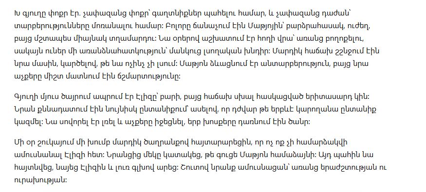 Кто-то громко сказал, что «никто не решится» взять в жёны Элизу. Другой, не стесняясь, добавил, что глухой фермер, мол, может и согласится — «ему ведь всё равно».