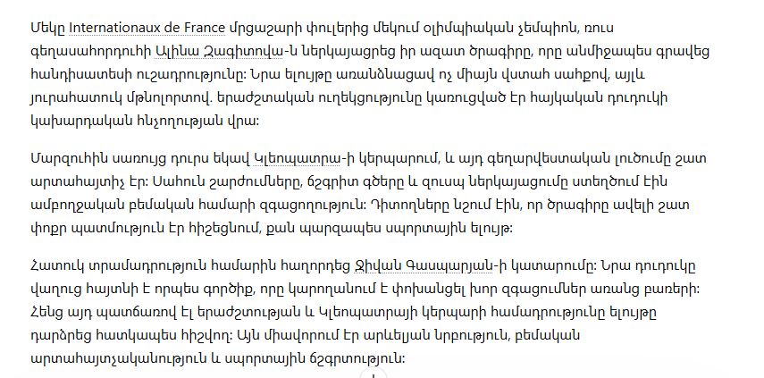 На одном из этапов Гран-при «Internationaux de France» олимпийская чемпионка Пхенчхана, российская фигуристка Алина Загитова, представила произвольную программу, которая сразу привлекла внимание публики. Ее выступление выделялось не только уверенным катанием, но и особой атмосферой: музыкальное сопровождение было построено на завораживающем звучании армянского дудука.