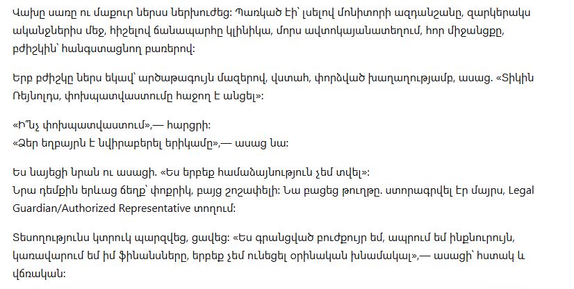 Он протянул мне форму, будто бумага могла всё объяснить. Я посмотрела на неё сквозь пелену боли. Строка «Подпись пациента» была пустой. Ниже, в строке «Законный опекун / уполномоченный представитель», стояла подпись моей матери — знакомый, витиеватый росчерк синими чернилами.