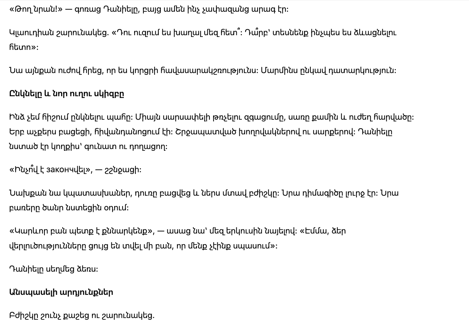Я не помню самого падения, только страшное ощущение полета, холодный ветер и удар. Когда я пришла в себя, то оказалась в больнице. Вокруг стояли трубки и приборы. Даниэль сидел рядом, бледный и дрожащий.