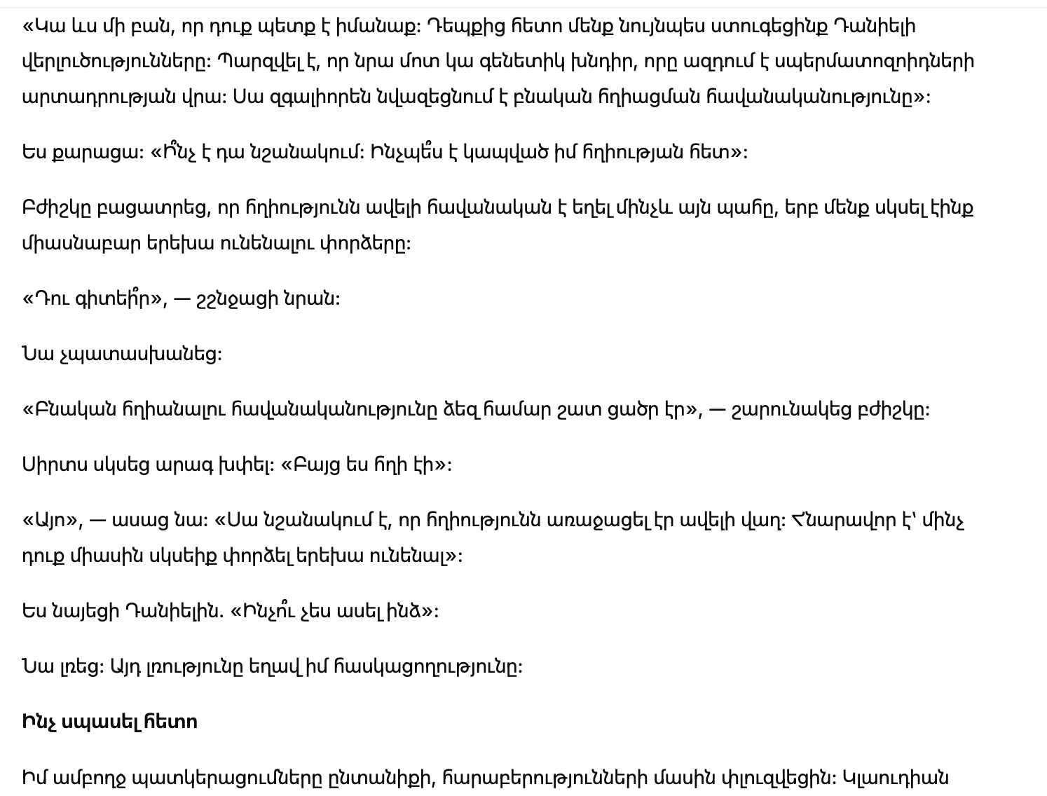 Не успела я осознать всё сказанное, как врач добавил: «Есть ещё кое-что, о чем вам нужно знать. Мы провели анализы на Даниэле после того, как произошёл инцидент. Результаты показали, что у него есть генетическая проблема, влияющая на производство сперматозоидов. Это значительно снижает вероятность естественного зачатия».