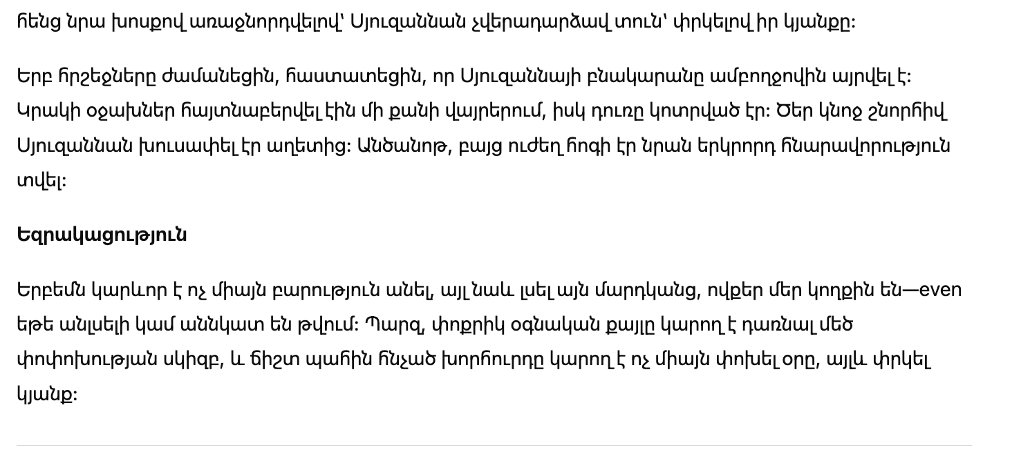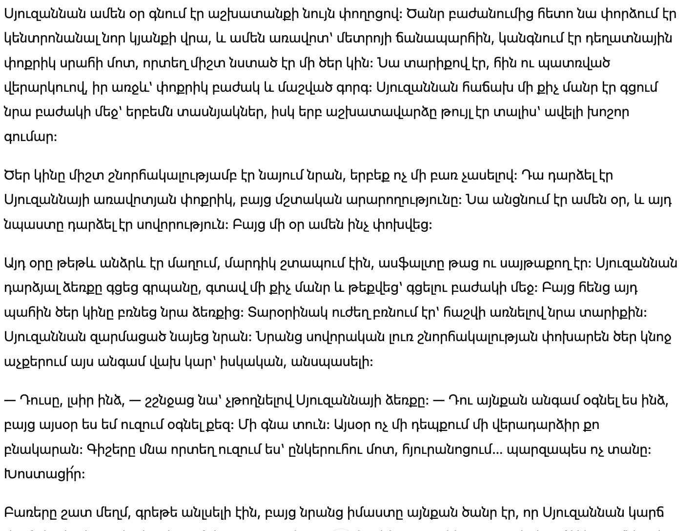 Каждый день Сюзанна шла на работу по одной и той же улице. После тяжёлого развода она старалась сосредоточиться на новой жизни и каждое утро по пути в метро заскоковала в аптечный киоск, где всегда сидела старушка. Она была немолодой, в рваном пальто, с маленькой кружкой и потрёпанным ковриком перед собой. Сюзанна часто подбрасывала ей немного мелочи — десятки, а порой и крупные купюры, если зарплата позволяла.