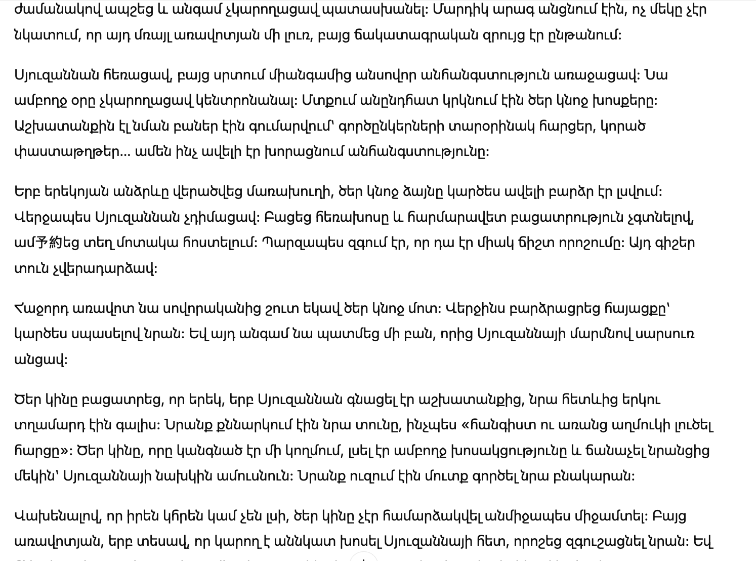 На следующее утро Сюзанна пришла к старушке раньше обычного. Та подняла голову, как будто ждала её. И в этот раз старушка рассказала ей то, что заставило её волосы встать дыбом. Сюзанна узнала, что в ту ночь, когда она ушла с работы, за ней следили двое мужчин. Они обсуждали её квартиру, как «спокойно и без шума решить с ней вопрос». Оказавшись в стороне, старушка услышала их разговор и поняла, что те мужчины — её бывший муж и его приятель, которые планировали получить доступ к её квартире.