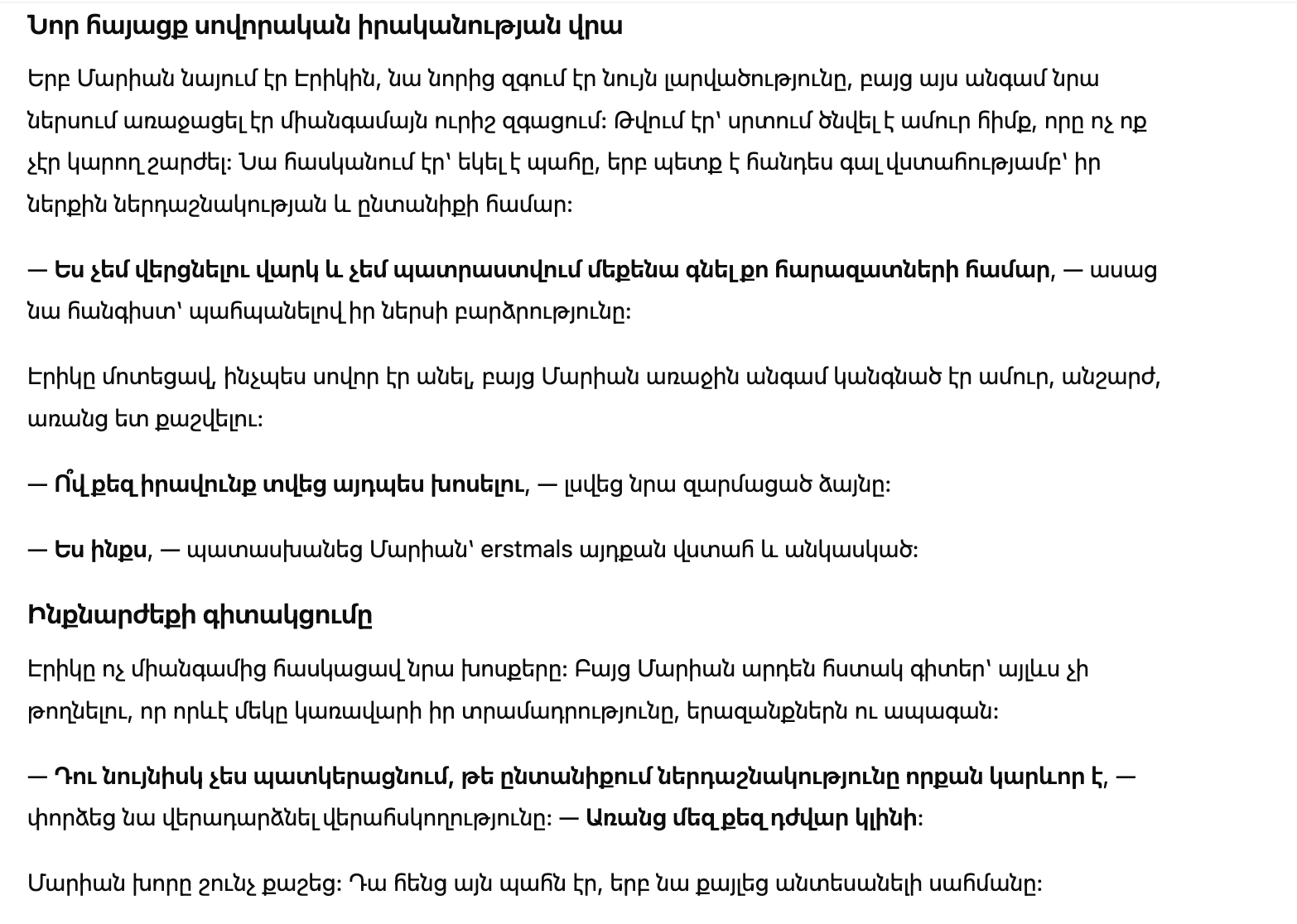 Когда Мария смотрела на Эрика, она чувствовала знакомое напряжение, но в этот раз внутри неё появилось совершенно другое ощущение. Будто в сердце выросла прочная основа, которую никто не мог поколебать. Она понимала: сейчас наступает момент, когда нужно проявить уверенность ради собственной гармонии и ради семьи.