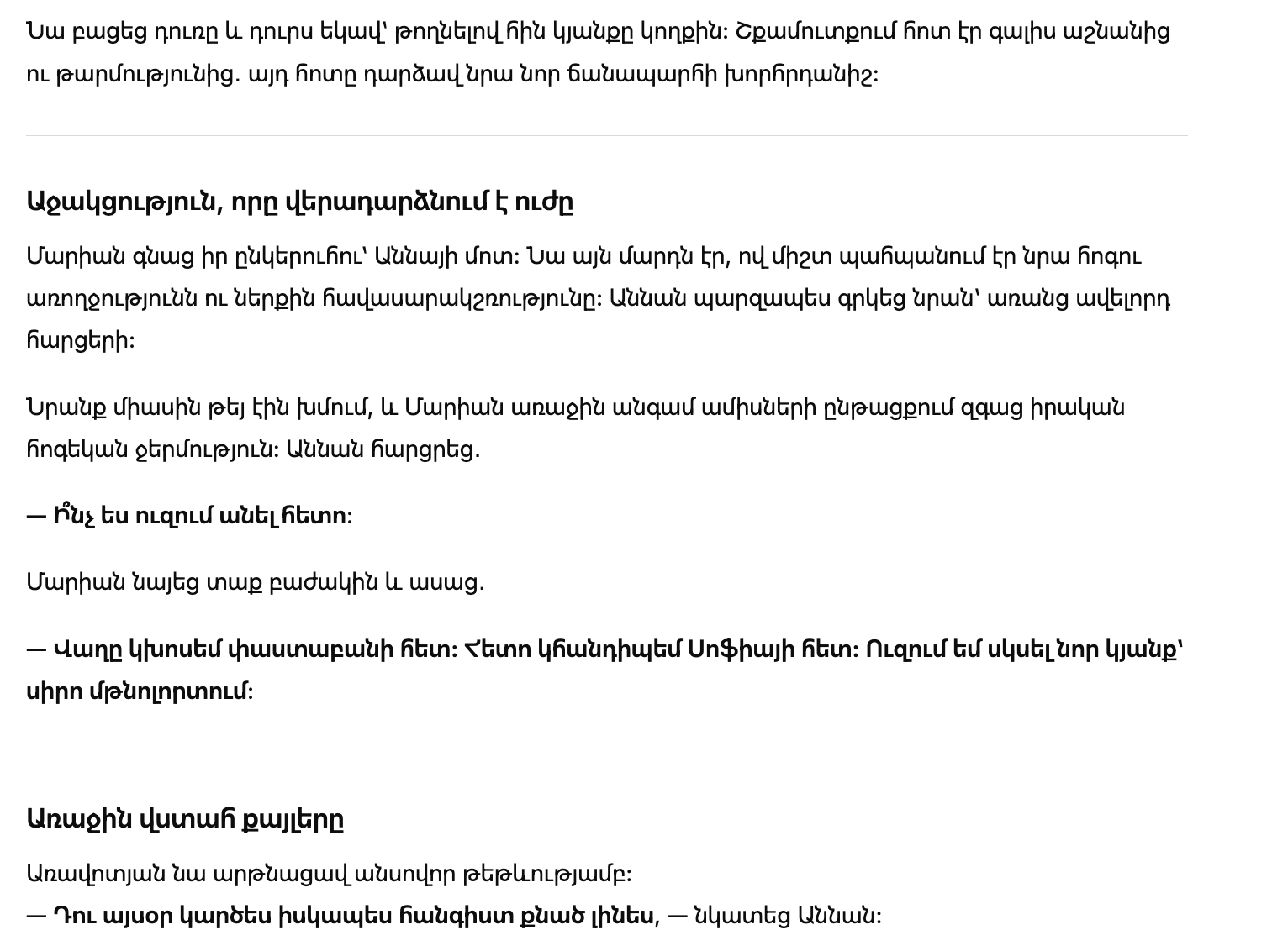 Она направилась к коридору, готовая сделать первый шаг к новой главе. Эрик попытался остановить её, но в его взгляде впервые появились неуверенность и непонимание. Мария посмотрела на него спокойно, сохраняя внутреннюю высоту.