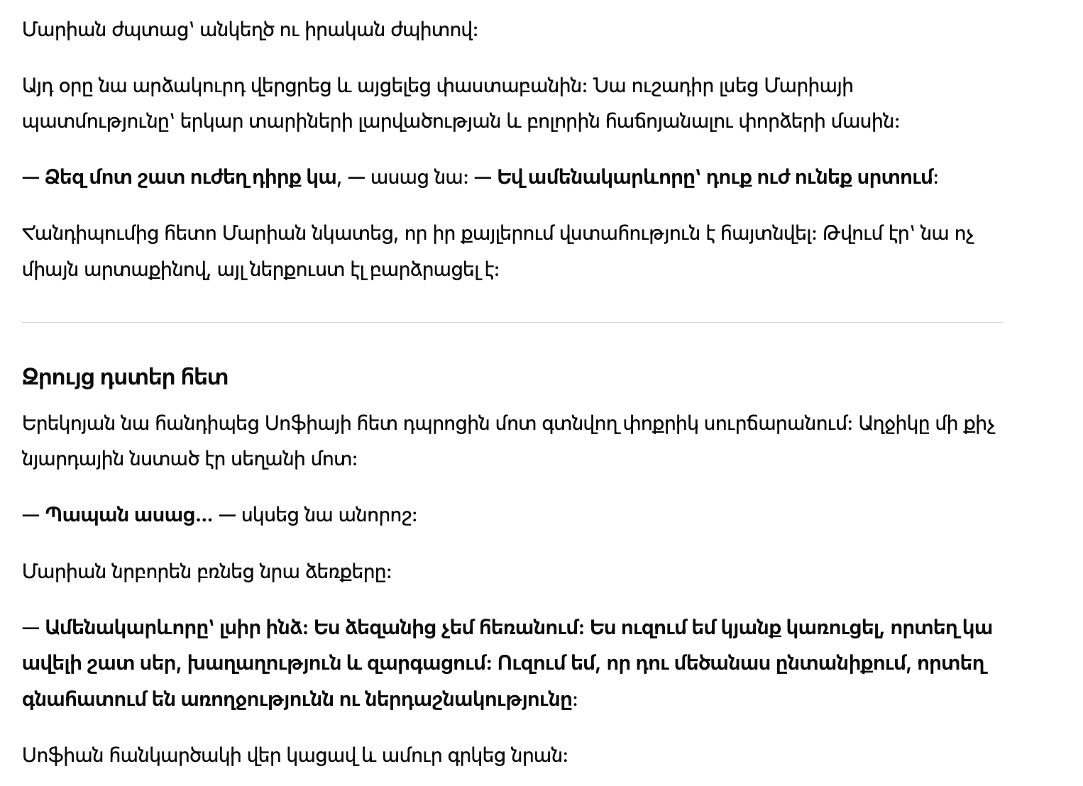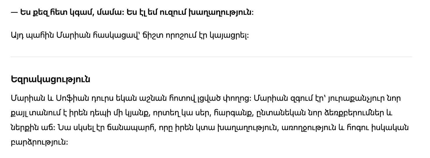 — Главное услышать меня. Я не ухожу от вас. Я просто хочу создать жизнь, где будет больше любви, спокойствия и развития. Я хочу, чтобы ты росла в семье, где ценят здоровье и гармонию.