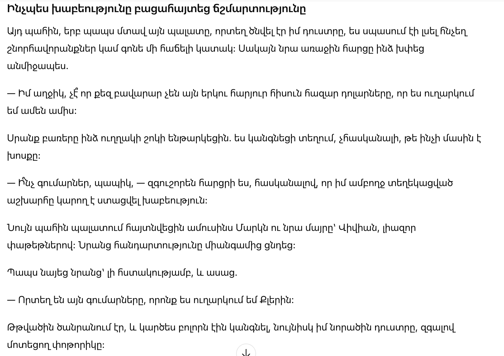 В тот момент, когда мой дедушка вошёл в палату, где родилась моя дочь, я ожидала услышать знакомые слова поздравления или, по меньшей мере, добрую шутку. Но его первый вопрос поразил меня: “Моя девочка, разве тебе недостаточно тех двухсот пятидесяти тысяч, что я перевожу каждый месяц?”