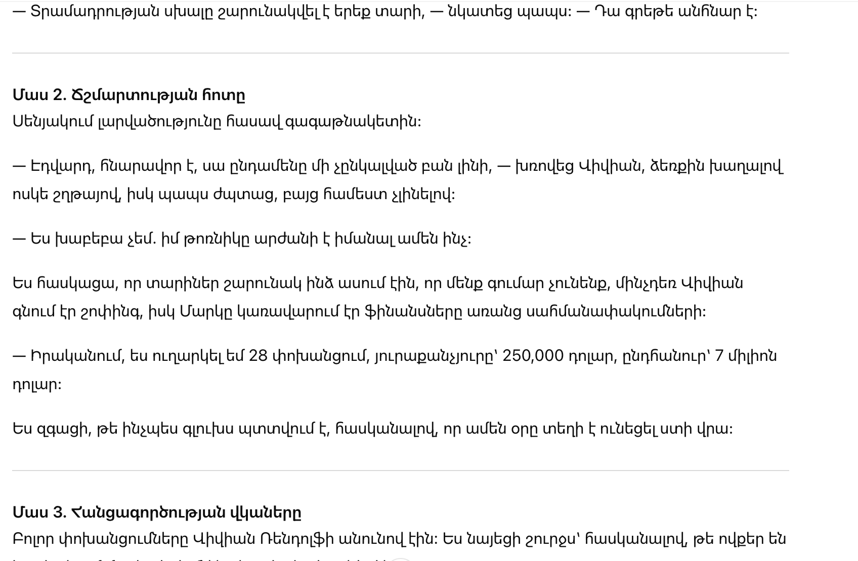 — На самом деле, — начал дед, — я отправил двадцать восемь переводов, каждый из которых составлял 250 000. Подреже, это семь миллионов долларов.