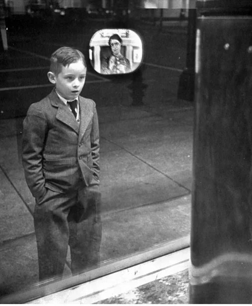 Подросток, любопытствующий, что изображено на экране одного из первых серийных телевизоров. 1947 год.