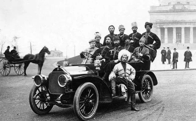 Кавказские воины в традиционных нарядах на современном автомобиле. Снимок сделан в начале 20 века.