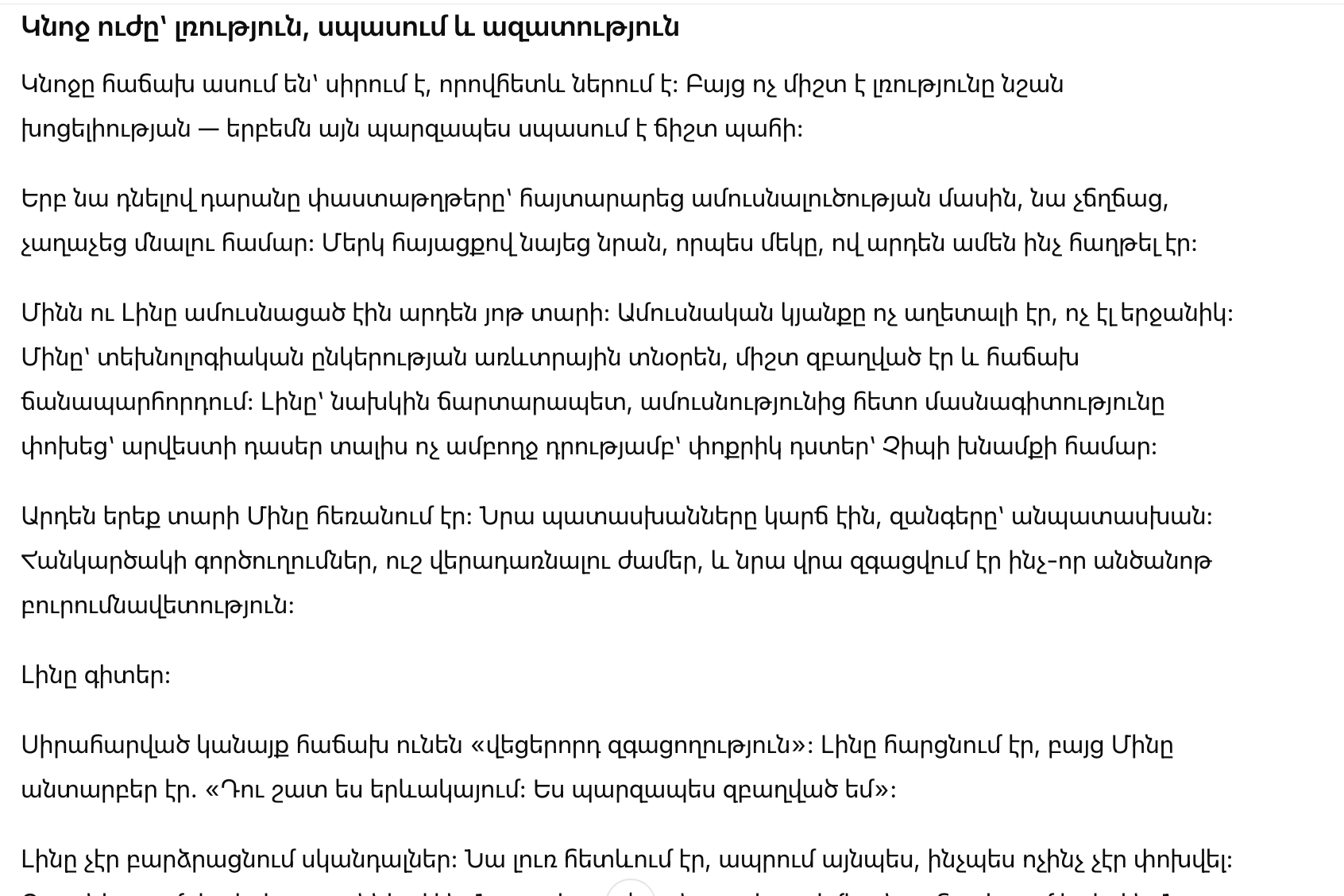 Она понимала, что ее молчание было самым острым оружием. Она не унижала Мина, не искала жалости от кого-либо.