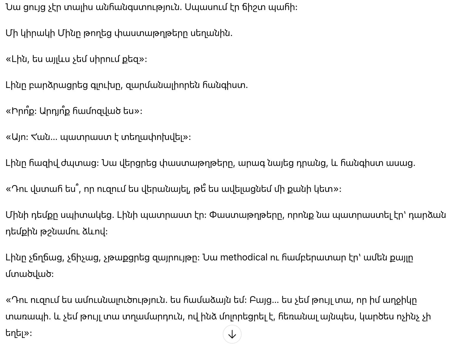 Линь едва ли сдерживала улыбку — это была улыбка, которую Мин никогда не видел. Она взяла бумаги, быстро просмотрела их и тихо произнесла: