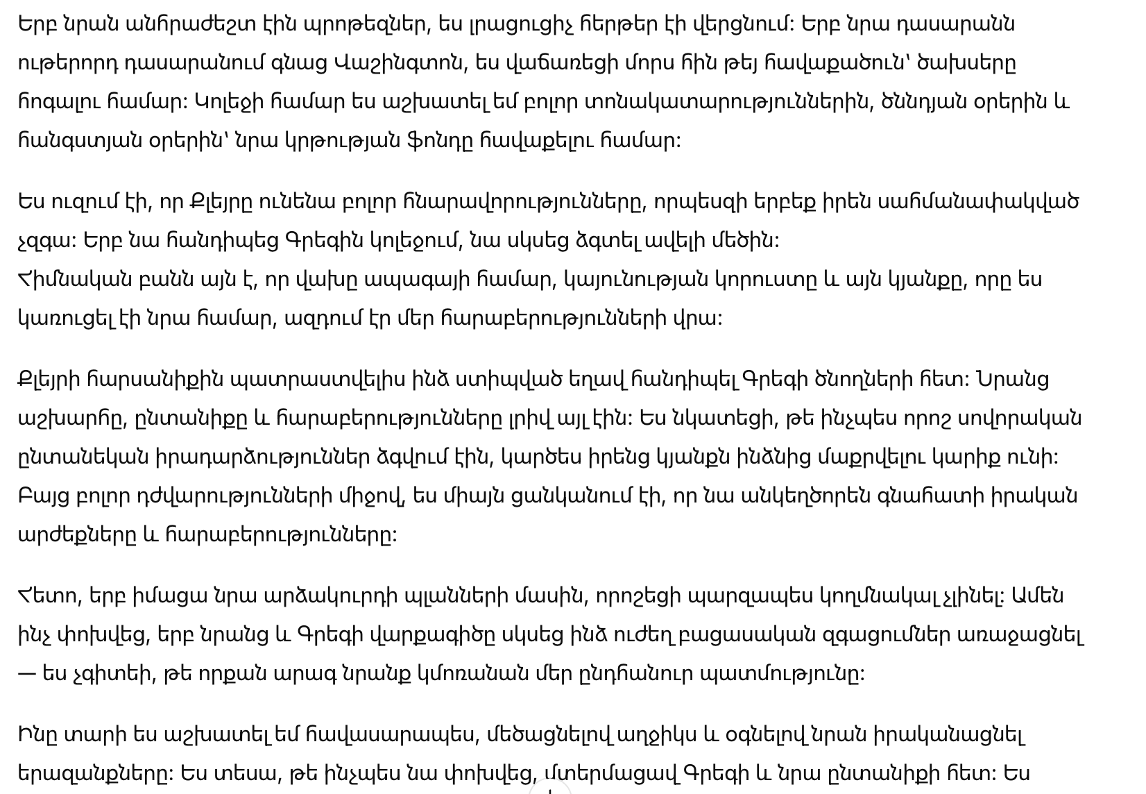 «Мам, я думаю, лучше, если ты не поедешь с нами на курорт Silver Palm в следующем месяце. Родители Аманду едут с нами, и места всем не хватает. Надеюсь, ты поймешь».