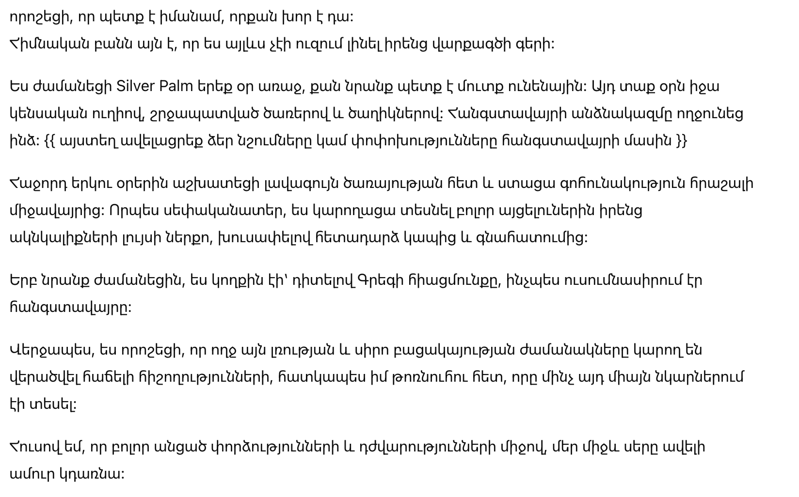 Я прибыла на Silver Palm за три дня до того, как они должны были заехать. В тот теплый день я спустилась по жизненно важной тропе, охваченной пальмами и цветами. Меня встретила персонал курорта, {{ добавьте здесь свои примечания или изменения по размещению }}.