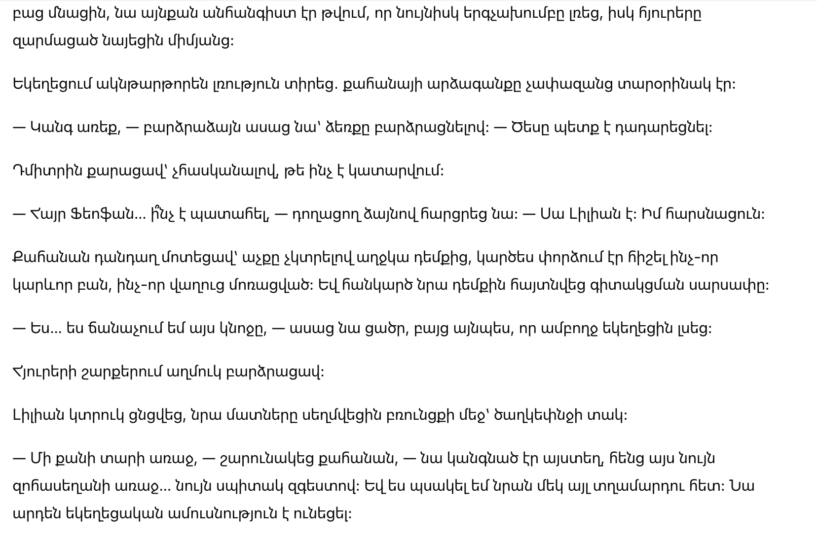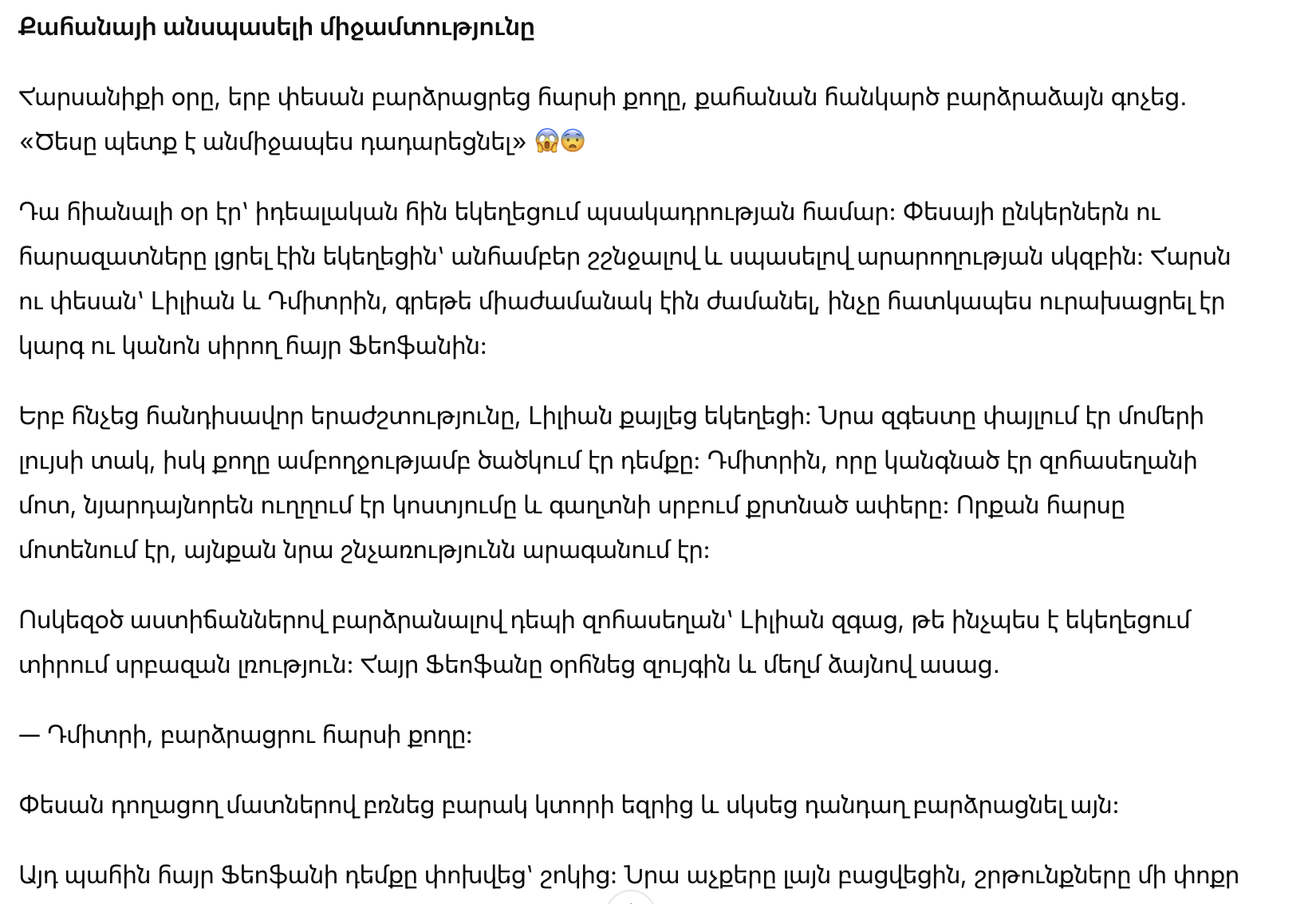 В этот миг лицо отца Феофана изменилось от шока. Его глаза широко раскрылись, губы приоткрылись, он выглядел так встревоженно, что даже хор замер, а гости переглянулись в недоумении.