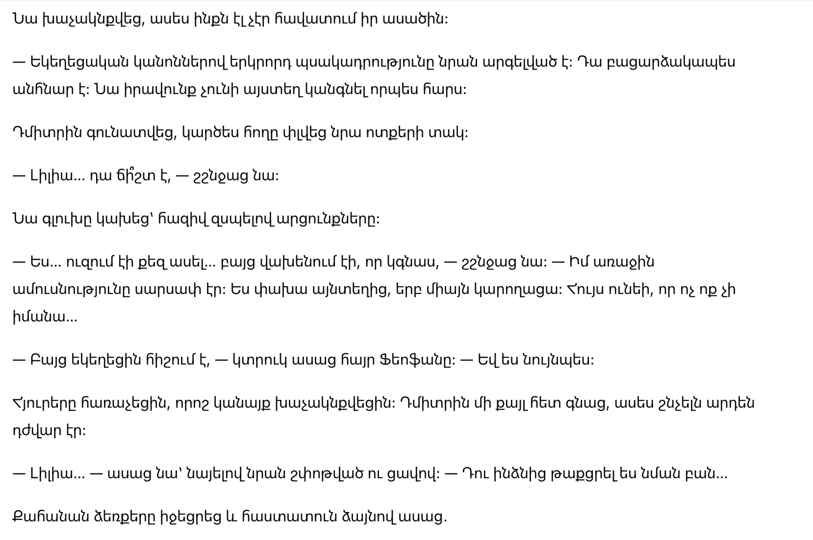 — Несколько лет назад, — продолжал священник, — она стояла здесь, перед этим же алтарём… в том же белом платье. И я венчал её с другим мужчиной. Она уже была замужем в церкви.