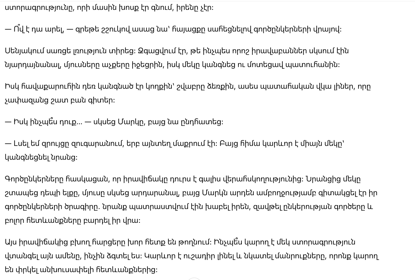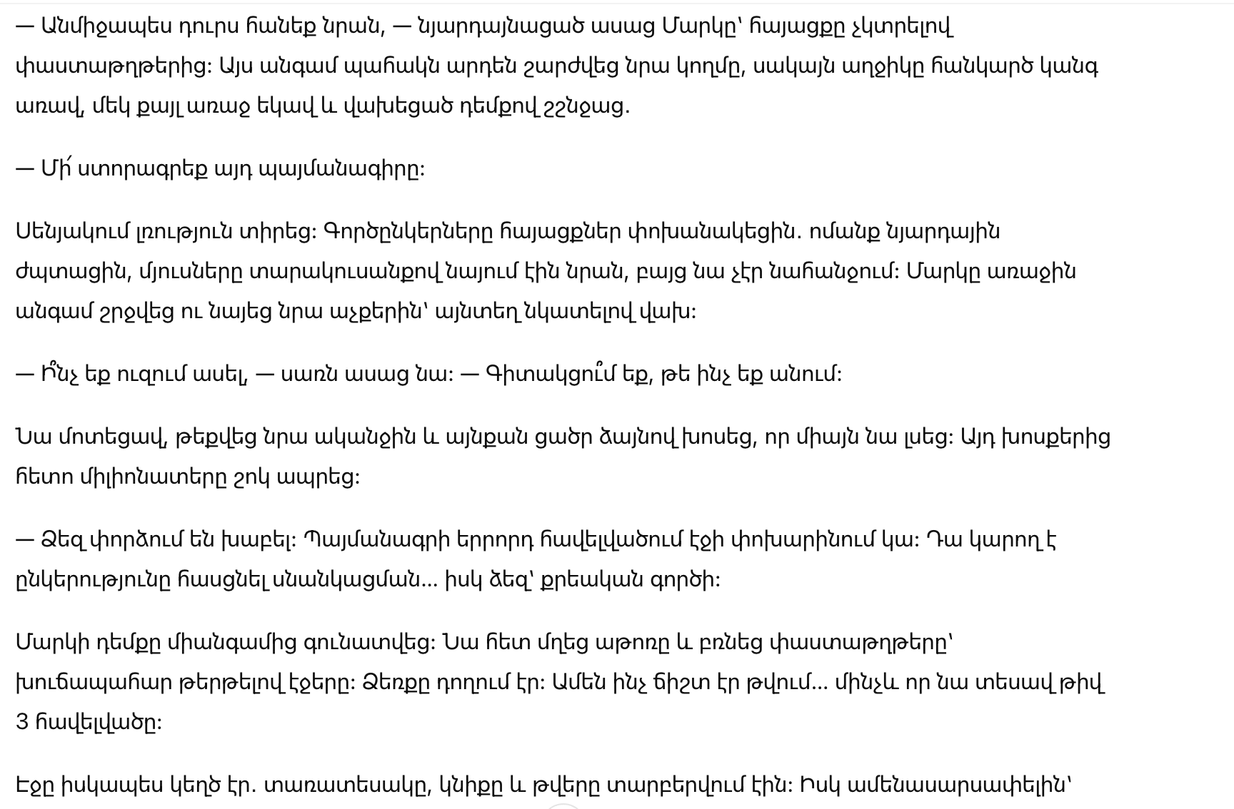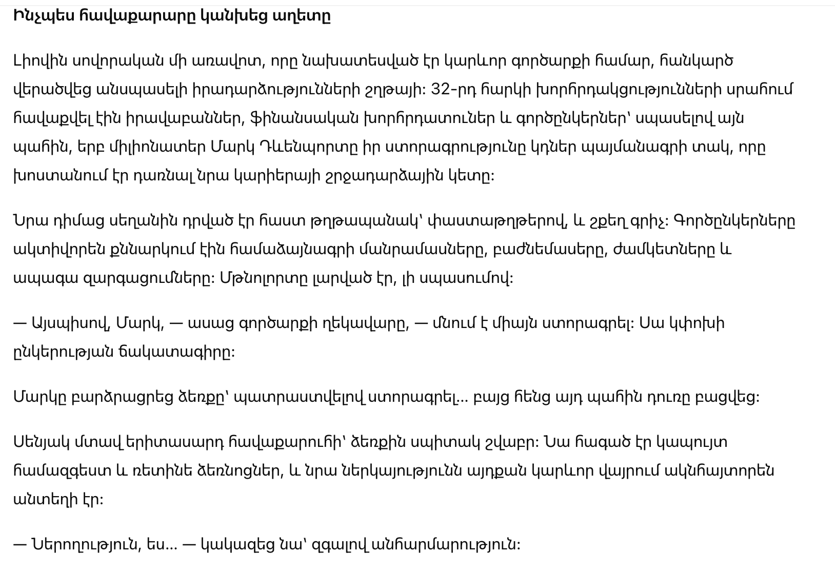 — Итак, Марк, — произнес руководитель сделки, — осталось лишь поставить подпись. Это изменит судьбу компании.