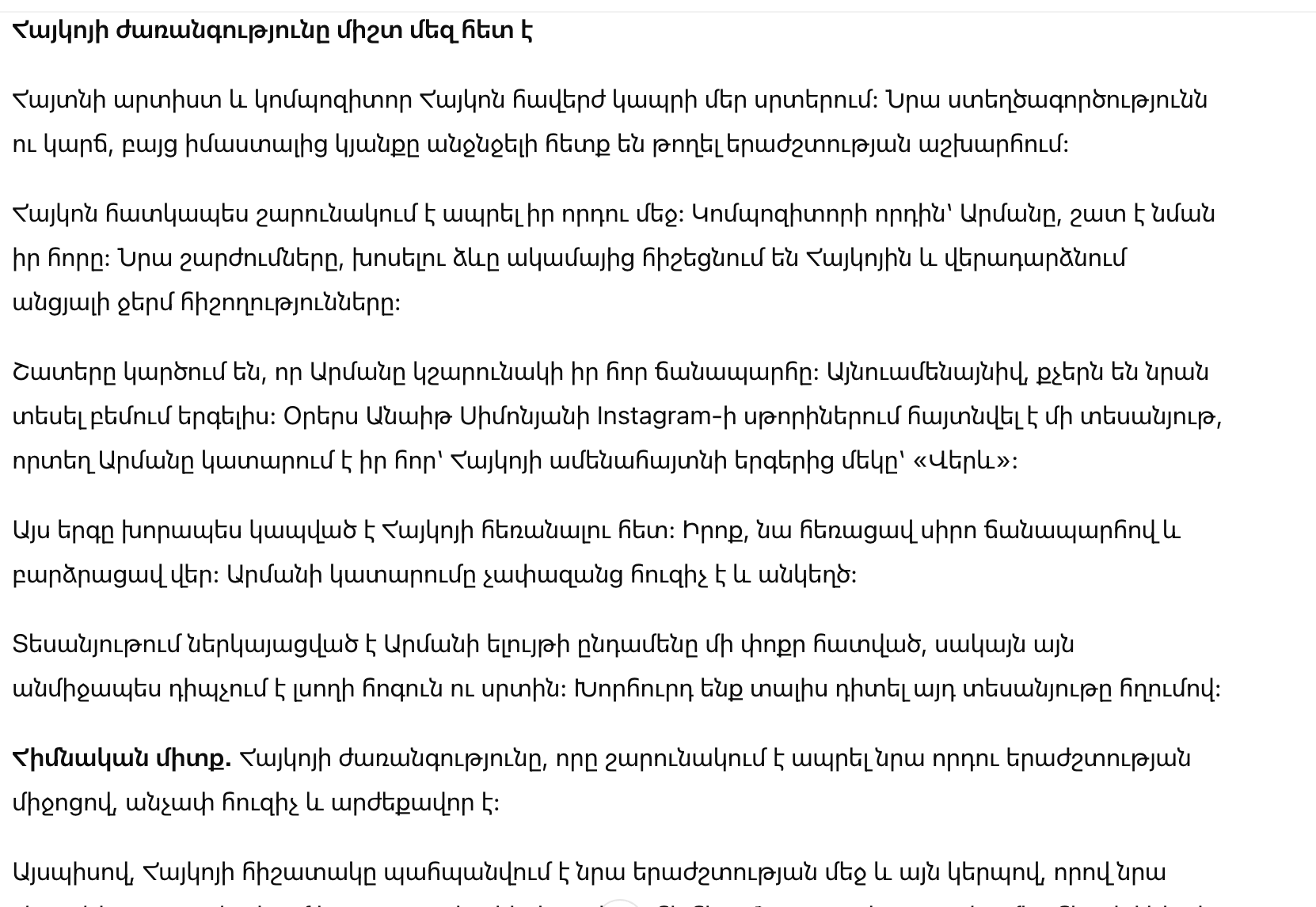 Многие считают, что Арман продолжит путь своего отца. И всё же почти никто не видел его во время исполнения. На днях в историях Instagram Анаит Симонян появился видеоролик, где Арман поет одну из знаменитых песен своего отца Хайко — «Вверх».