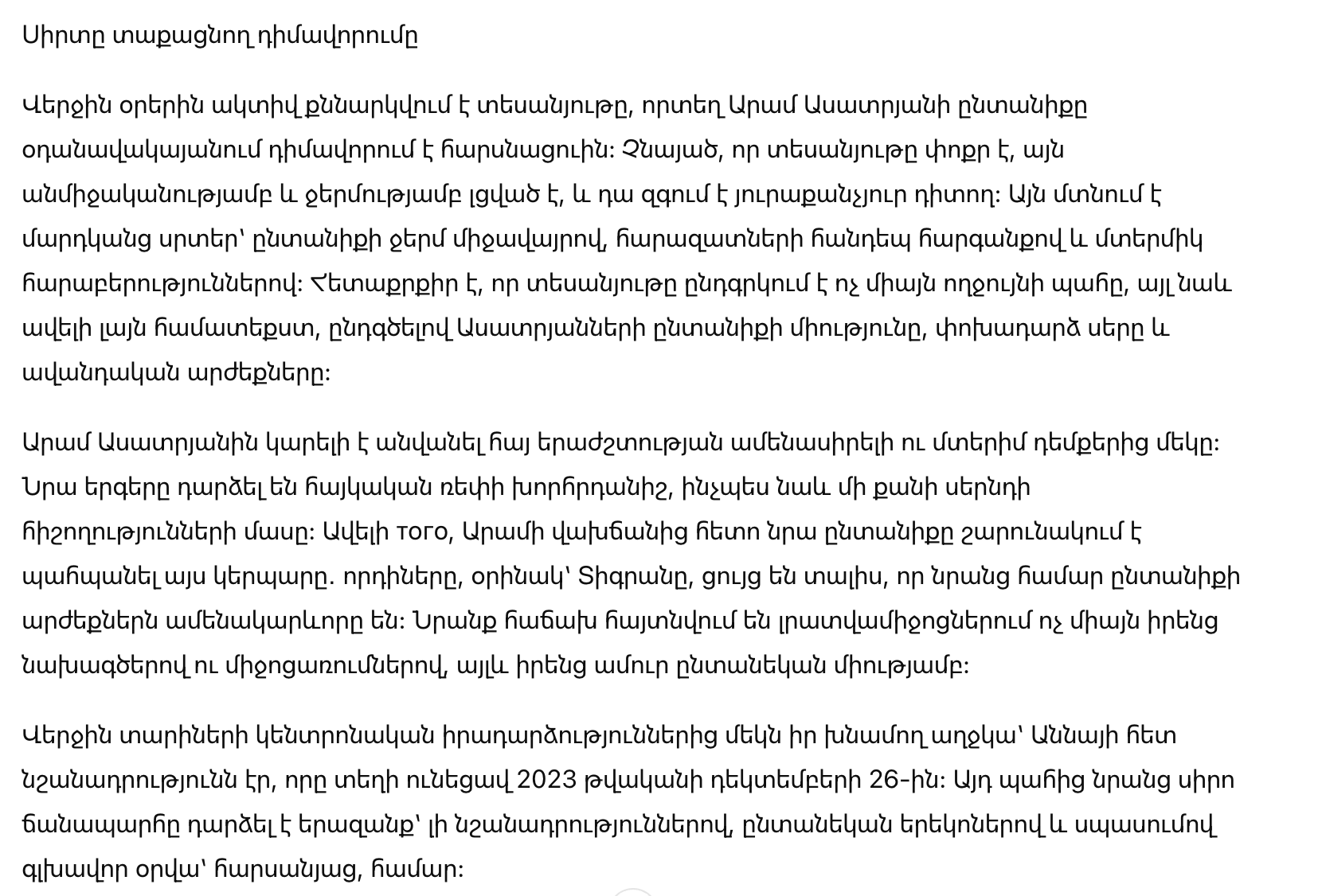 Заключение: Семейные ценности Арама Асатряна остаются важной частью его наследия, отражая единство, любовь и поддержку между членами семьи. Их традиции и история являются символом того, как можно сохранить близость в мире, полном изменений.