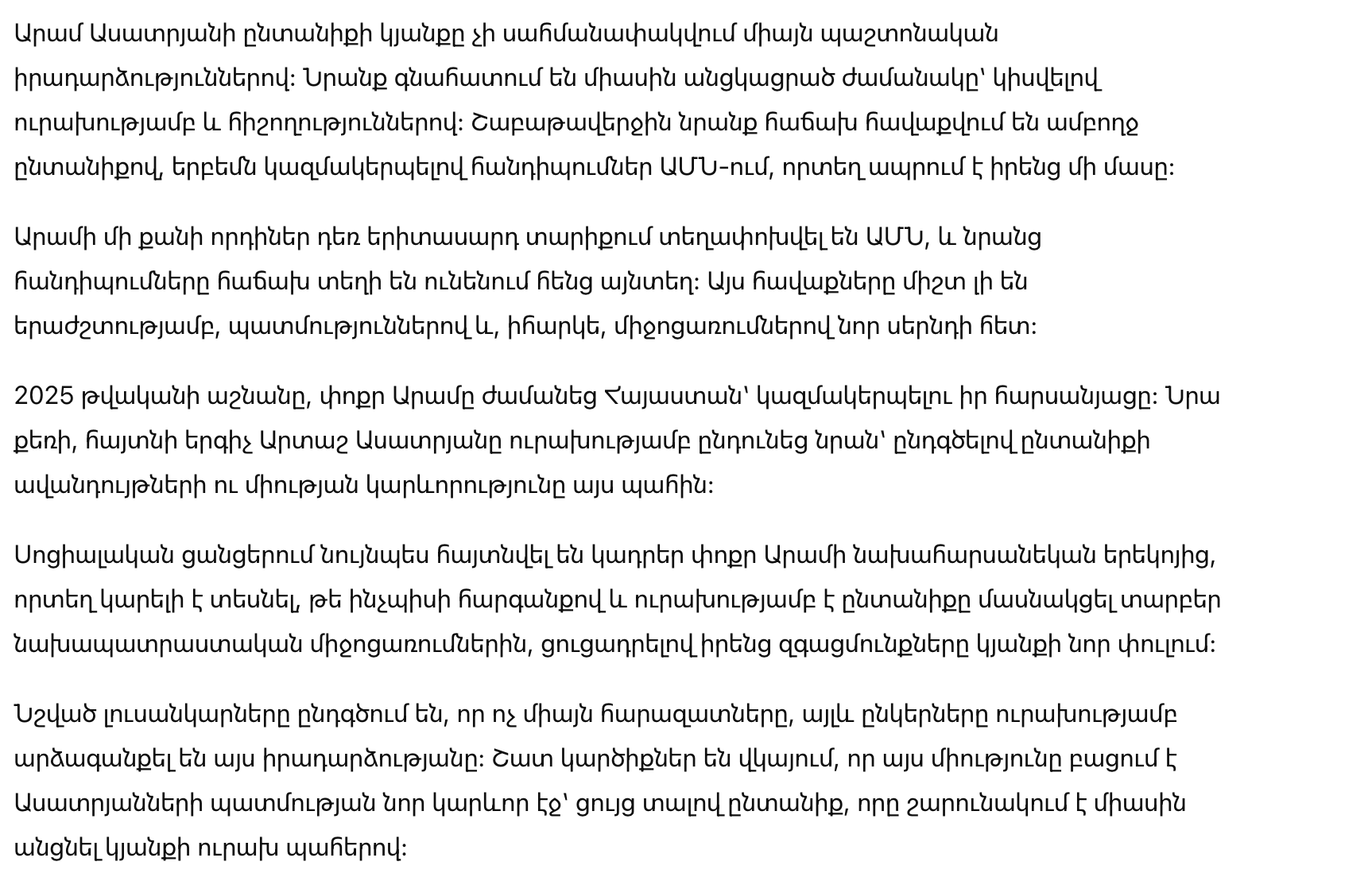 Этой осенью, в 2025 году, младший Арам приезжает в Армению, чтобы организовать свою свадьбу. Его дядя, известный певец Арташ Асатрян, с радостью встретил его, подчеркивая важность семейных традиций и единства в этот момент.