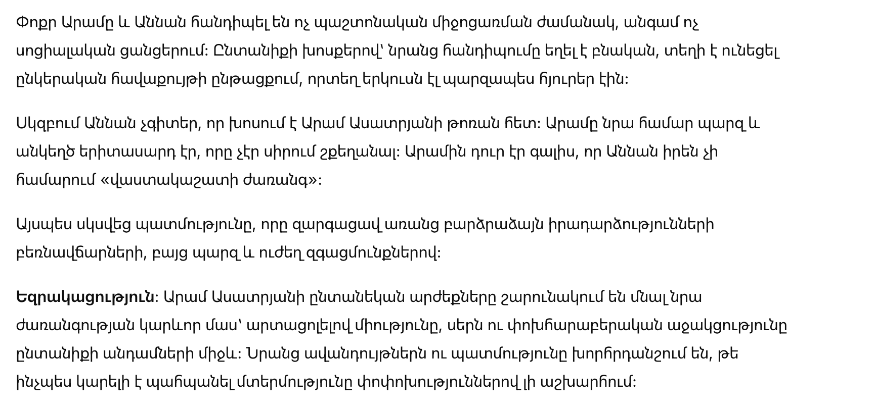 Сперва Анна и не догадывалась, что общается с внуком Арама Асатряна. Для неё Арам был просто скромным и честным парнем, не склонным к хвастовству. Араму же нравилось, что Анна не относилась к нему как к «наследнику знаменитости».