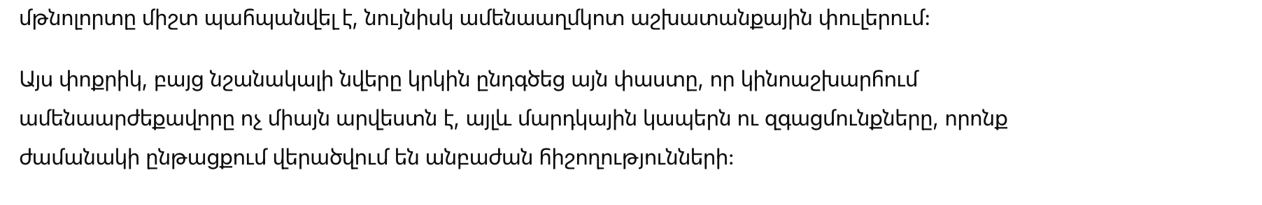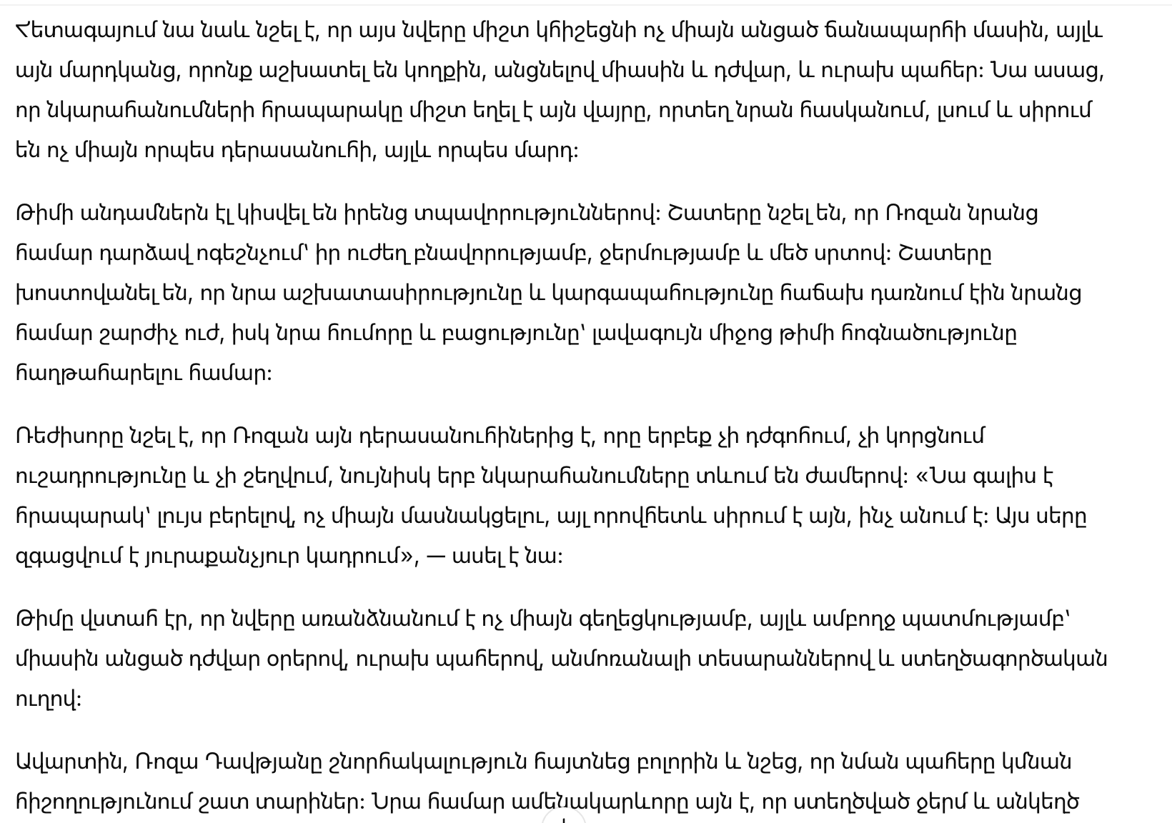 В конце концов, Роза Давтян поблагодарила всех и отметила, что такие моменты останутся в памяти на много лет. Для нее самое важное — это то, что созданная теплая и искренняя атмосфера сохранилась всегда, даже в самые напряженные рабочие этапы.